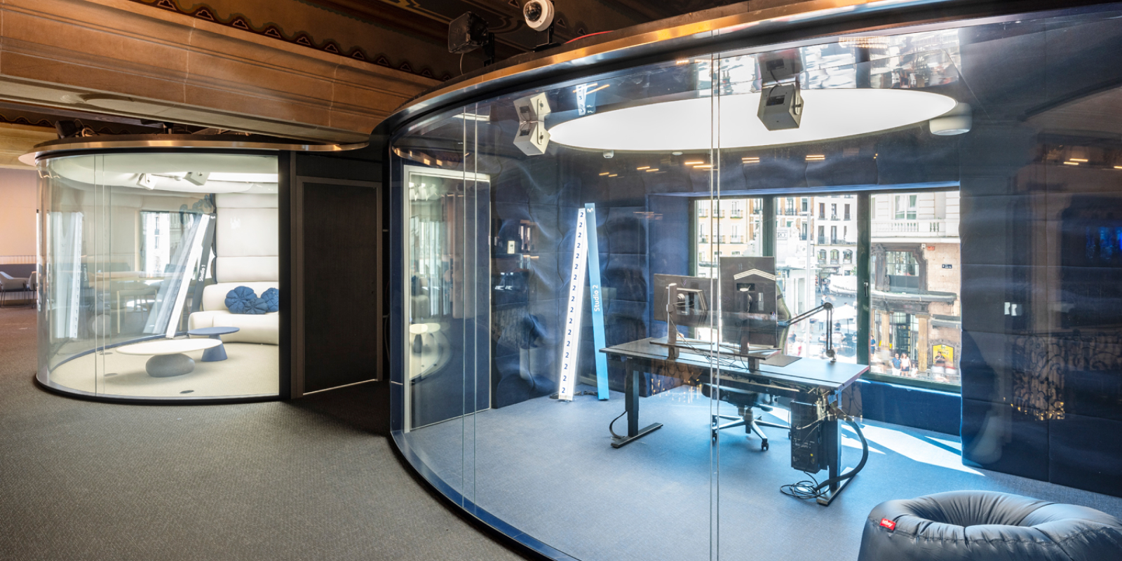 Vidros curvos e painéis transparentes que valorizam a luz natural e respeitam a arquitetura do icónico edifício Telefónica, em Madrid — criando espaços abertos, funcionais e colaborativos.